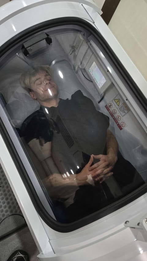 Na fotografii, kterou stihl nahrát na Instagram těsně před procedurou, leží s klidně sepjatýma rukama v bílém sarkofágu s průhledným víkem.